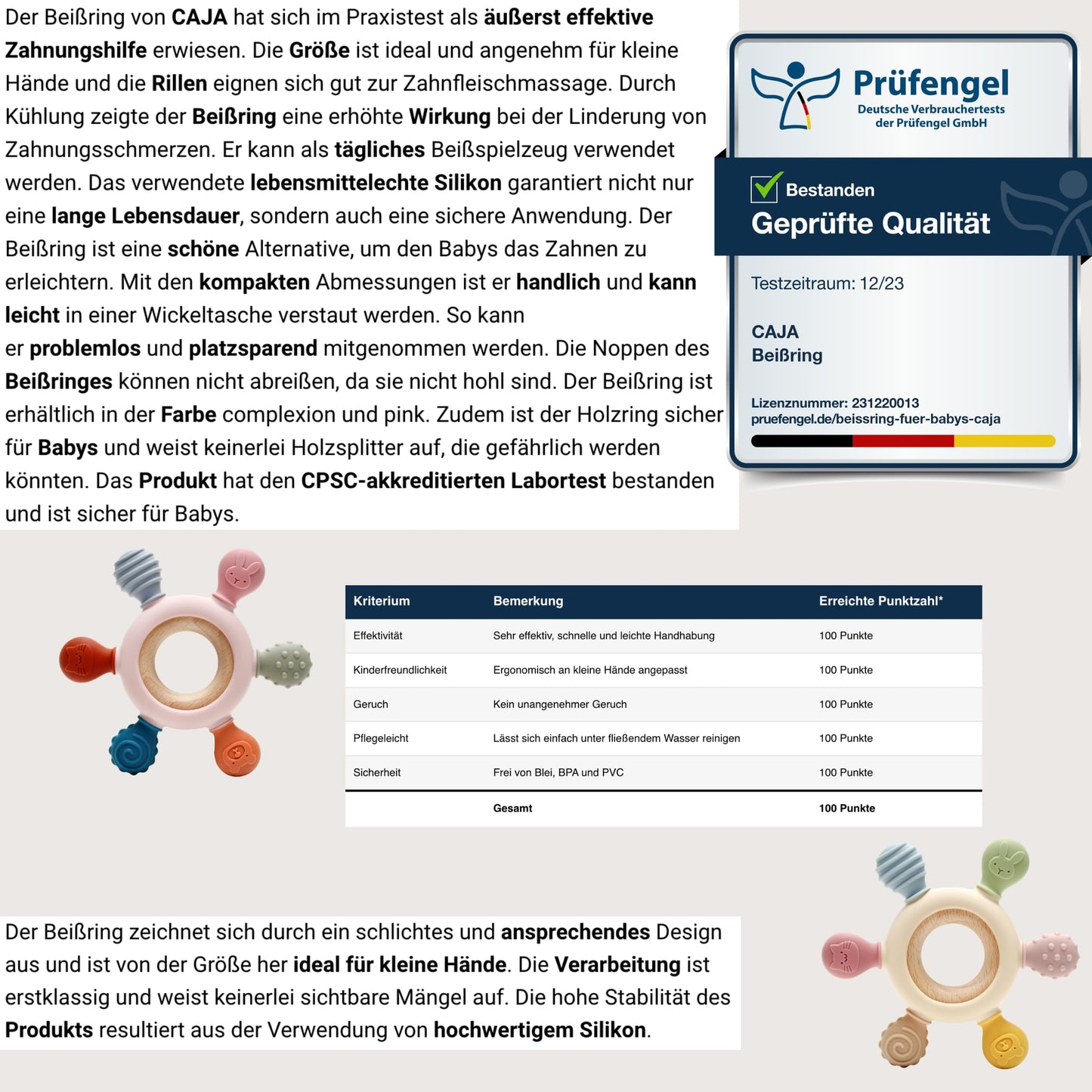 The CAJA Baby Teether is made of 100% food-grade, BPA-free silicone and meets all EU safety standards. With its textured surface, it effectively relieves teething pain while promoting your baby's sensory development. The handy design is ideal for small hands and perfect for on-the-go use.