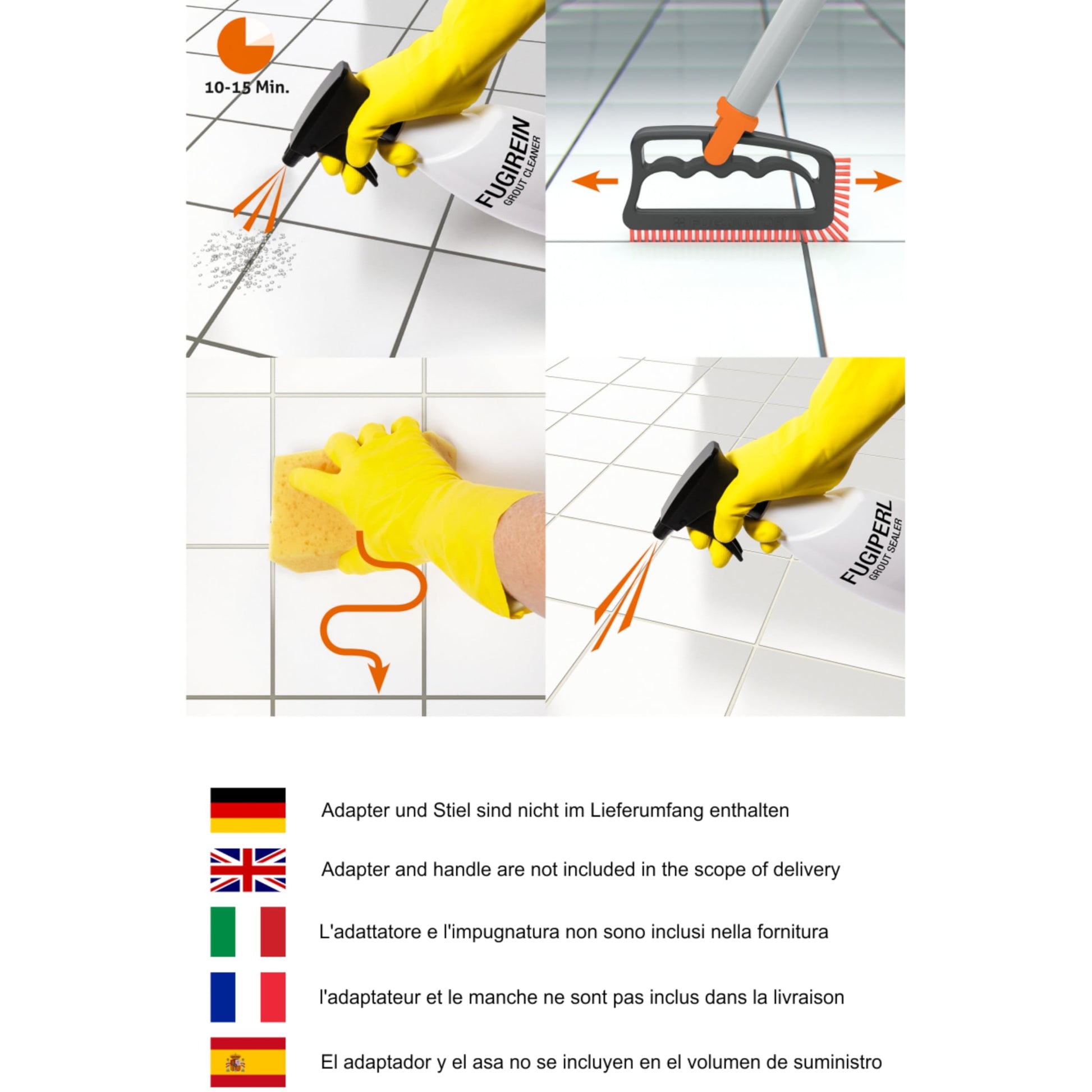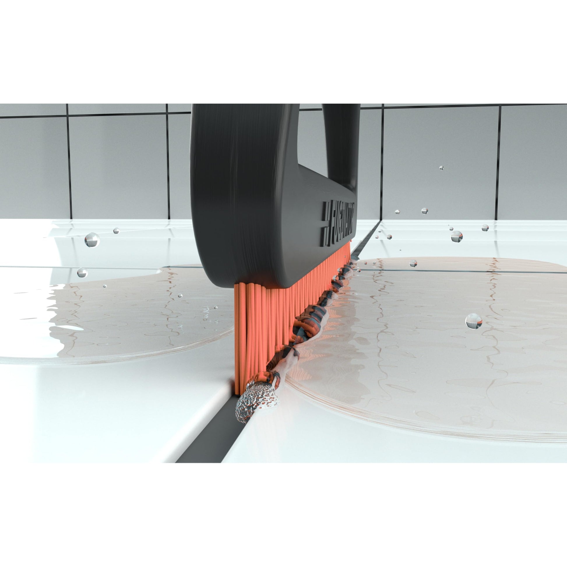 The FUGINATOR grout brush in gray/orange is the specialist for clean grout joints – thorough, ergonomic, and sustainable. Thanks to its special bristle arrangement, it cleans even tight spaces such as tile joints, window frames, or fixtures effectively and effortlessly . The ergonomic handle fits perfectly in any hand – suitable for both right- and left-handed users – and ensures optimal power transmission. Particularly sustainable: The handle is made of 100% recycled plastic . Chemical-resistant and economical in its use of cleaning agents – ideal for the bathroom, kitchen, or household.