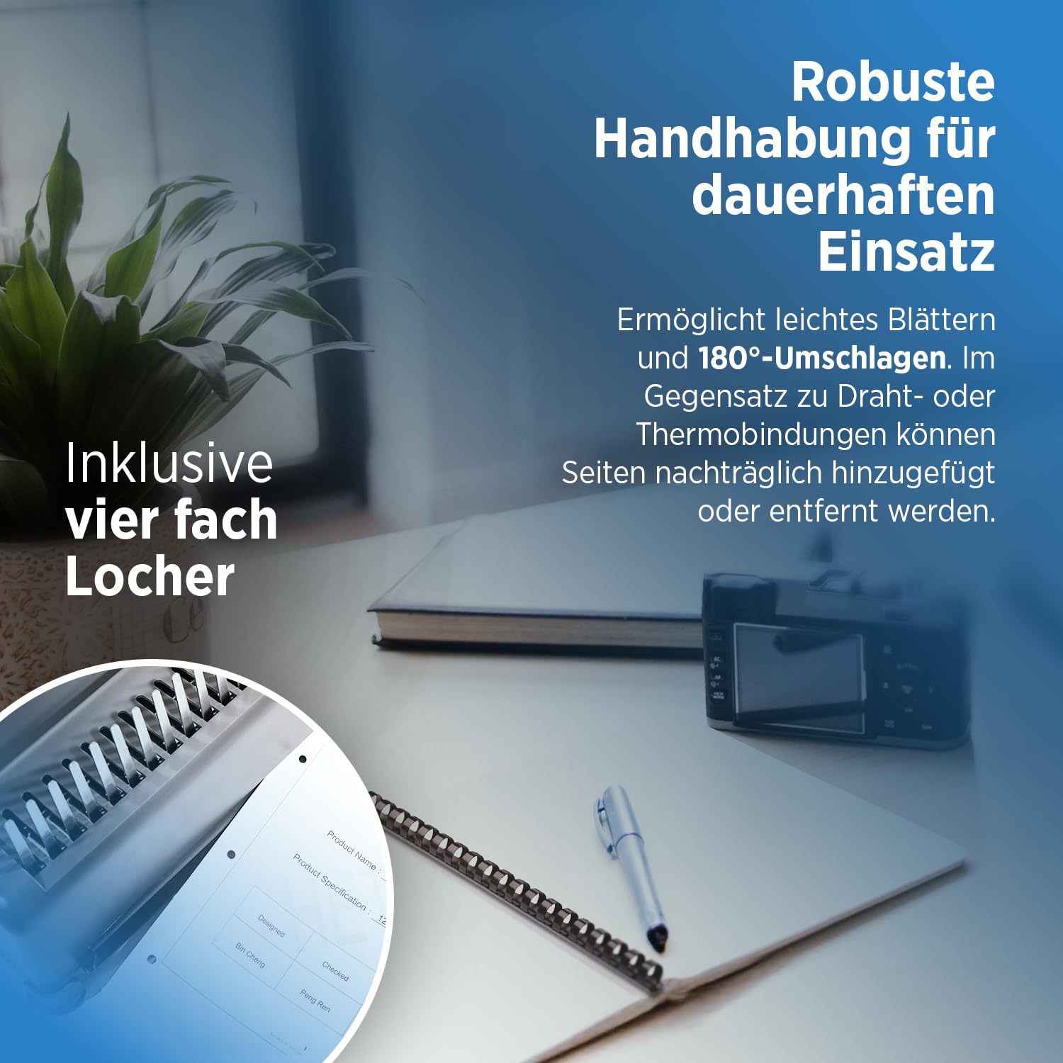 - Flexible post-processing: Pages can be removed or added later thanks to plastic binding spines