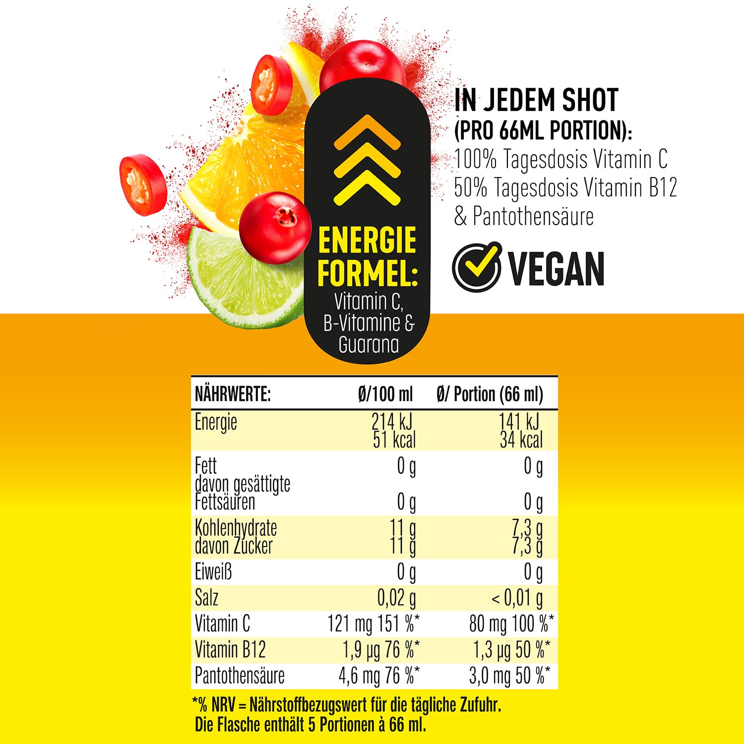 With a blend of orange, cranberry and guarana extract, these shots not only offer an exceptional taste, but also provide your body with 100% vitamin C, 50% vitamin B12 and pantothenic acid per serving.