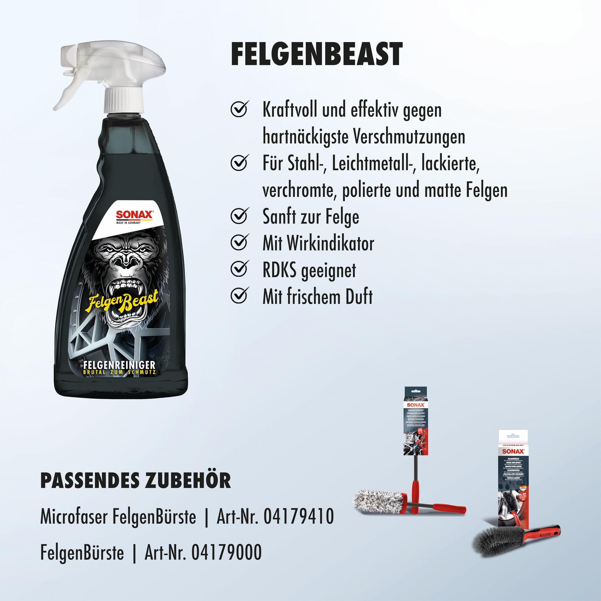 Gentle on materials : pH-neutral, does not damage the rim surface or wheel bolts. Ideal for rims with TPMS.