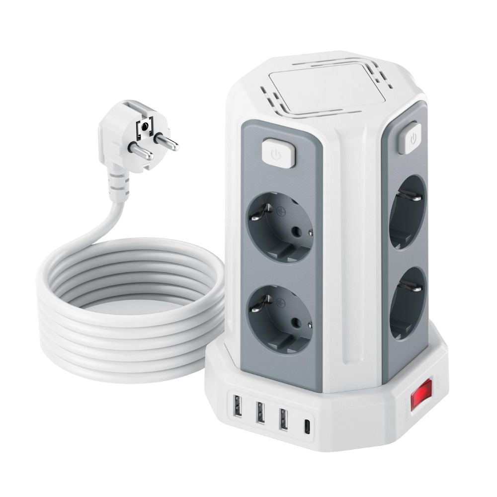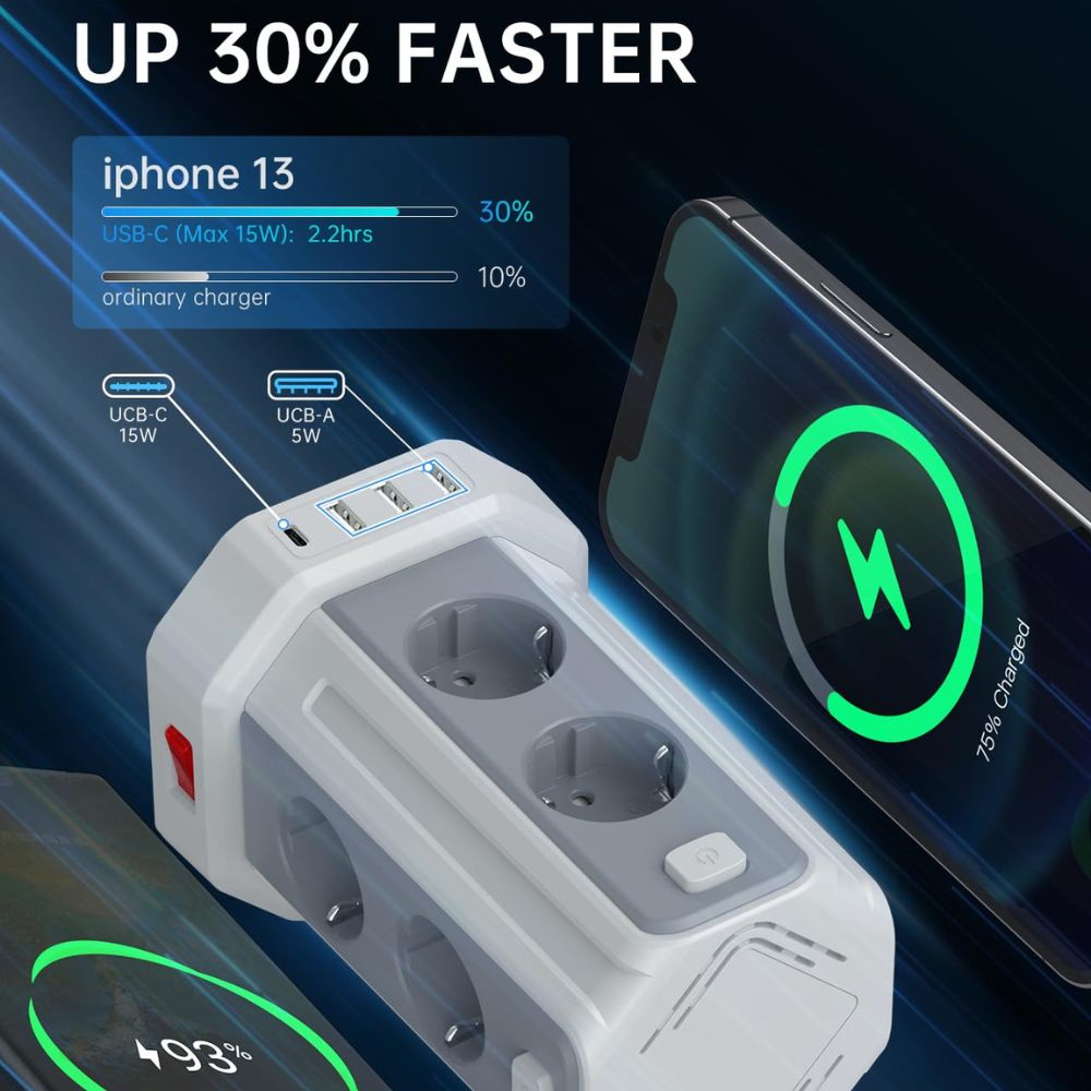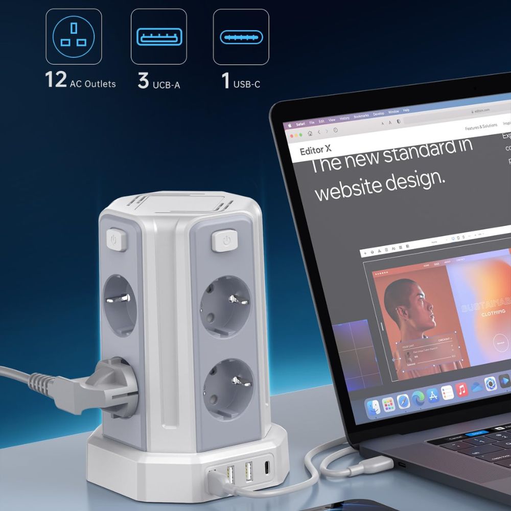 8 sockets + 3 USB-A (5V/2.4A) + 1 USB-C (5V/3A): Powers desktop devices and charges mobile devices quickly and conveniently.