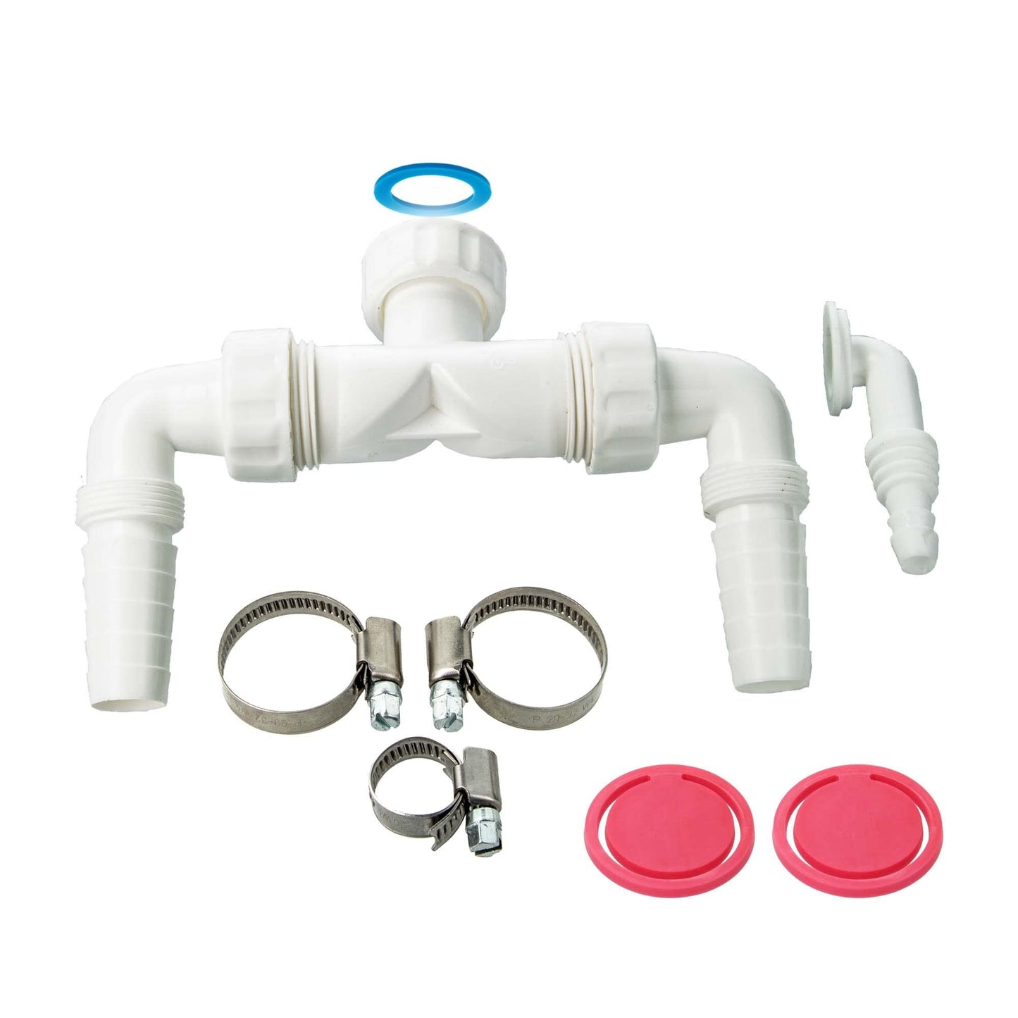 With two angled hose nozzles (Ø 18-23mm) and an additional condensate hose nozzle (Ø 8-17mm), the connection is ideal for households with multiple appliances. Hose clamps are included for easy and secure installation.