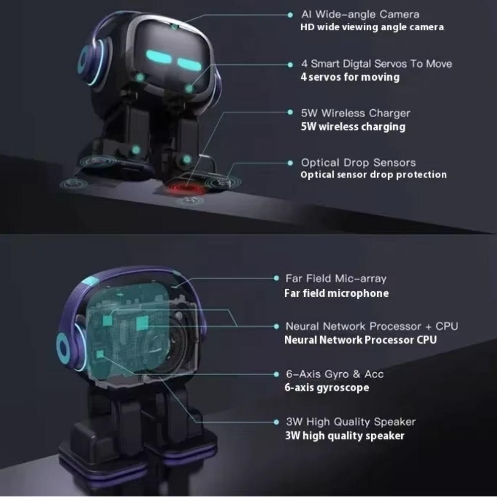 Robot intelligent doté de personnalité : EMO reconnaît jusqu'à 10 personnes, explore son environnement de manière indépendante et réagit aux interactions - parfois avec curiosité, parfois même légèrement offensé lorsqu'il est dérangé.