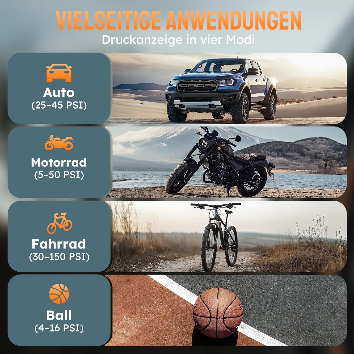 Vielseitige Anwendung: 4 voreingestellte Modi für Auto, Fahrrad, Motorrad & Ball - abschaltautomatik bei Erreichen des Drucks