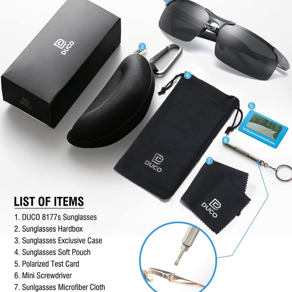 Die DUCO 8177SDE-11 kombiniert polarisierte TAC-Gläser mit einem ultraleichten Aluminium-Magnesium-Rahmen. Sie schützt zuverlässig vor 100% UVA- und UVB-Strahlung, reduziert Blendung und sorgt für klare Sicht - ideal für Outdoor und Alltag.