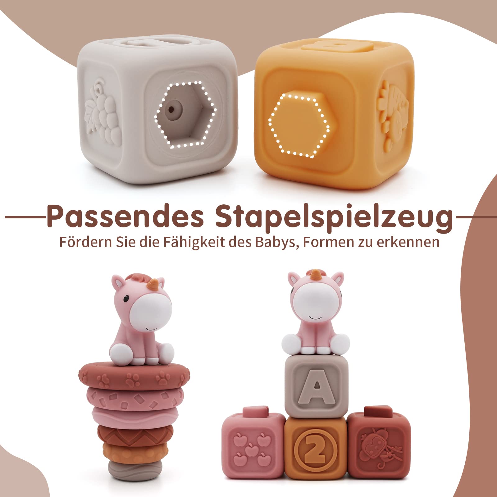 Die Bausteine bestehen aus weich-kau barem, lebensmittelechtem Silikon - perfekt als Beißhilfe bei Zahnungsschmerzen. Dank Luftloch erzeugen sie beim Drücken ein leises Geräusch und regen die Hörentwicklung an. Das Set ist leicht zu reinigen und ideal für kleine Hände.