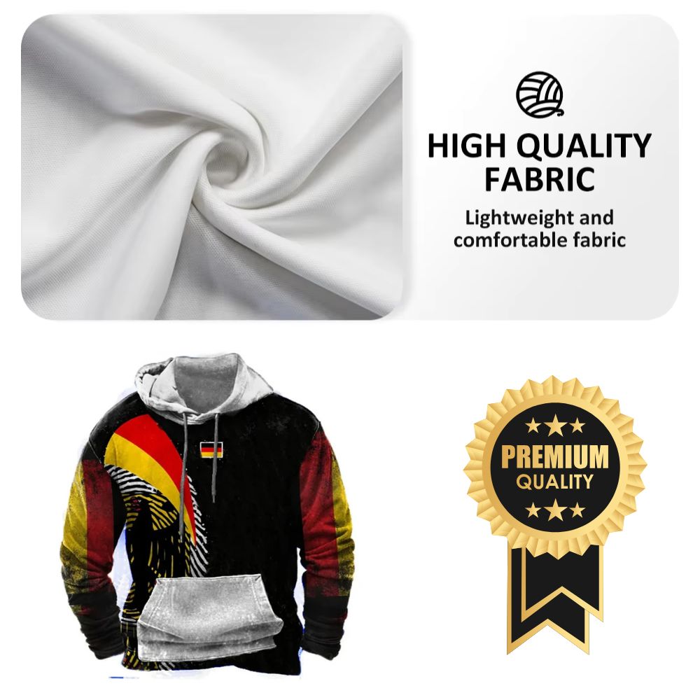 Einzigartiges Design: Dezente deutsche Flagge auf der Brust, verschwommene Deutschland-Farben an den Ärmeln und ein beeindruckender Adler im Fingerabdruck-Stil in den Farben der Flagge, der von der Schulter bis zum Beckenbereich verläuft.