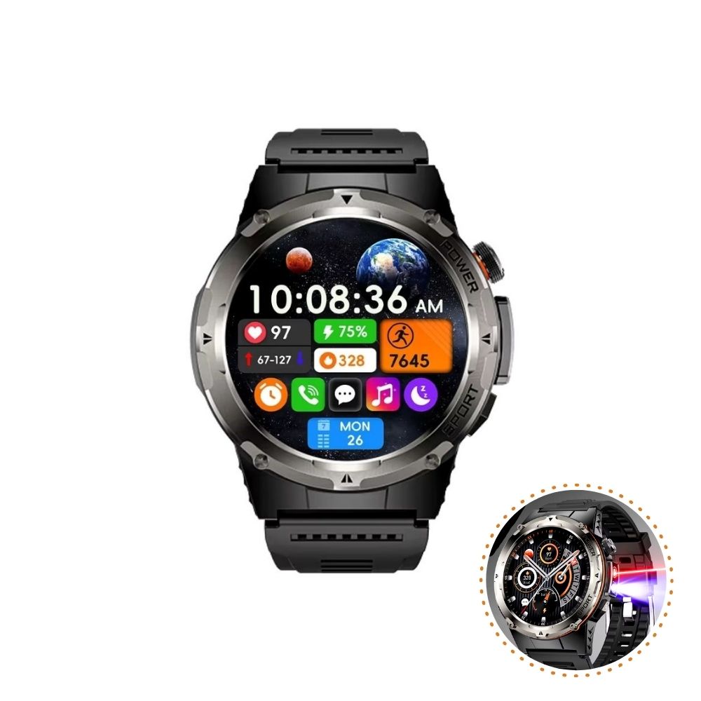 Diese Uhr kombiniert fortschrittliche Technologien wie UV- und Infrarotlicht mit Fitness- und Gesundheitsfunktionen. Der integrierte Laser (rot und infrarot) hebt sie von anderen ab und macht sie zum unverzichtbaren Begleiter für Outdoor-Sportler, Abenteurer und Technikliebhaber.